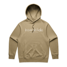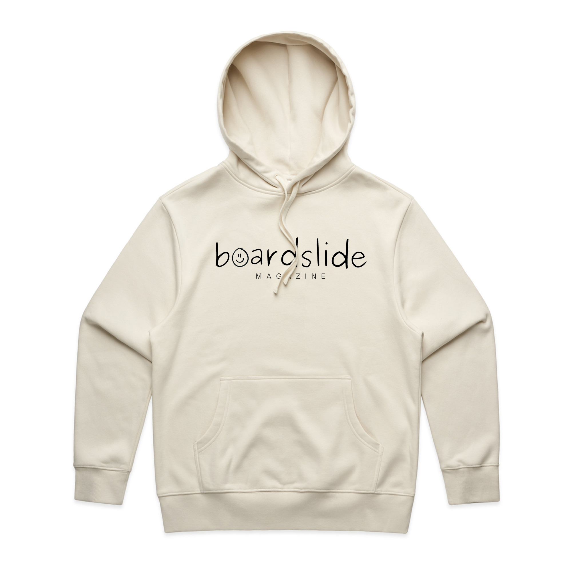 The Boardslide Magazine Smiley Hoody. Tailored in a premium 11.8 oz heavy weight cotton-rich blend with an oversized, baggy fit. Featuring inset sleeves, draw cords, a cozy pullover hood with self-fabric lining, and 2x2 ribbing on the cuffs and hem.
